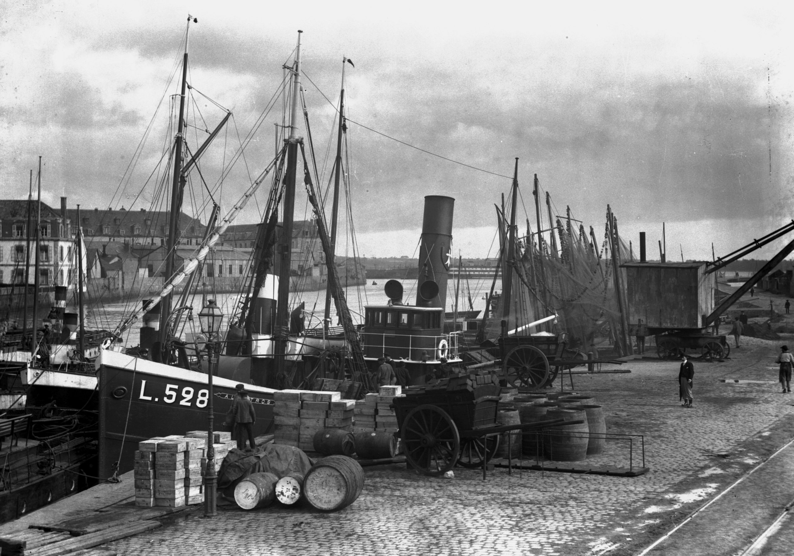 Lorient à la fin du 19e siècle. Au bassin à flot, des bateaux de pêche à la voile. Des nouveaux venus !